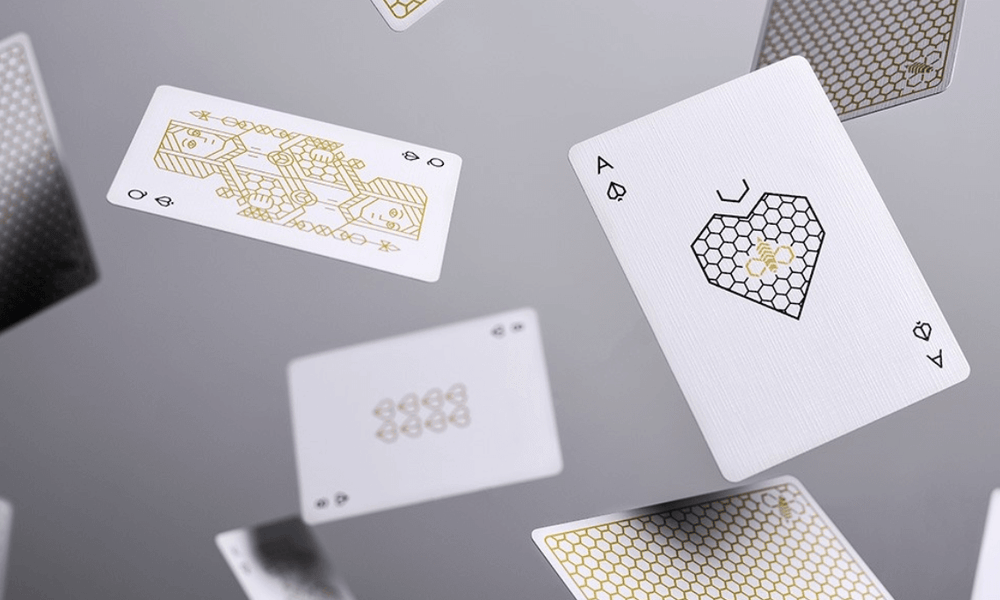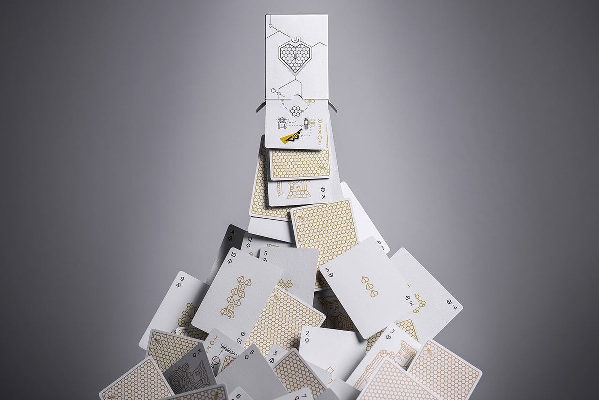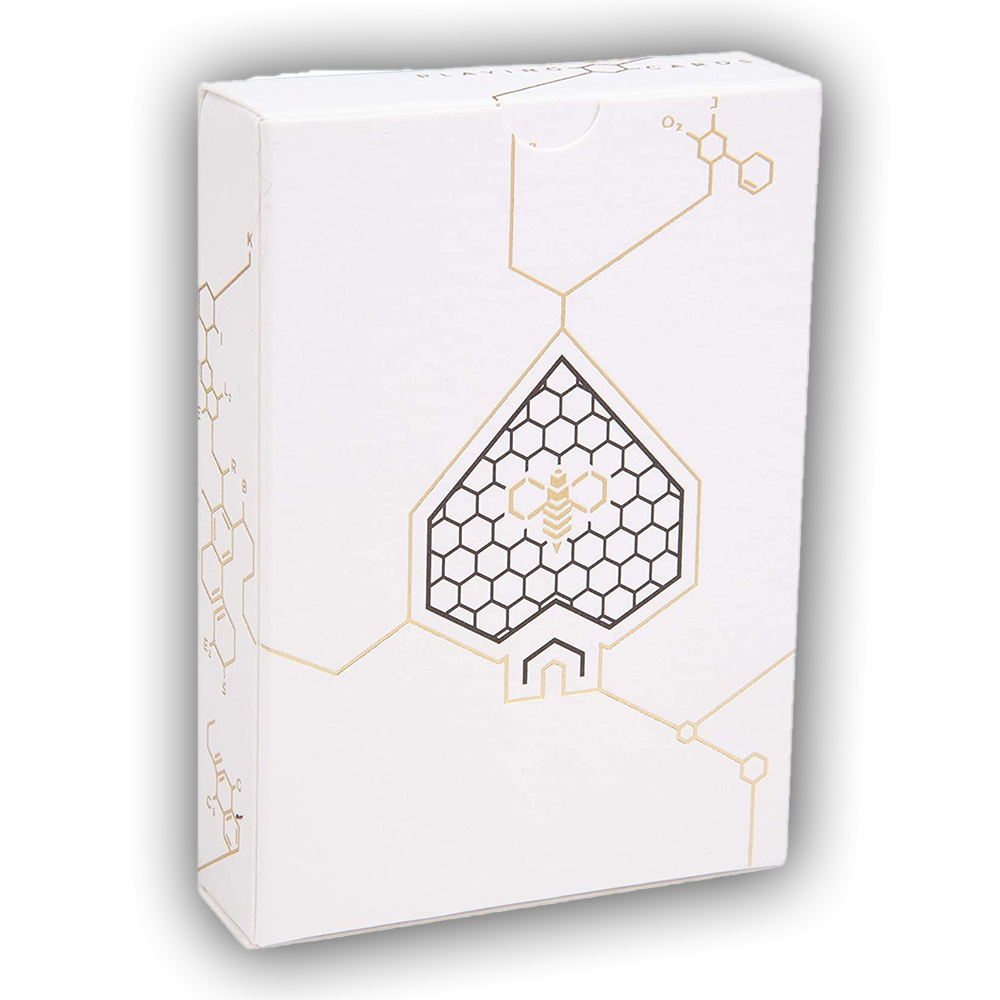 پشت‌کارت‌ها طرح شش‌ضلعی معروف Killer Bee رو دارن، اما این‌بار با رنگ طلایی درخشان، و جعبه‌ش با کاغذ عاجی و جزئیات طلایی فویلی ساخته شده — فوق‌العاده لوکس و خاص.